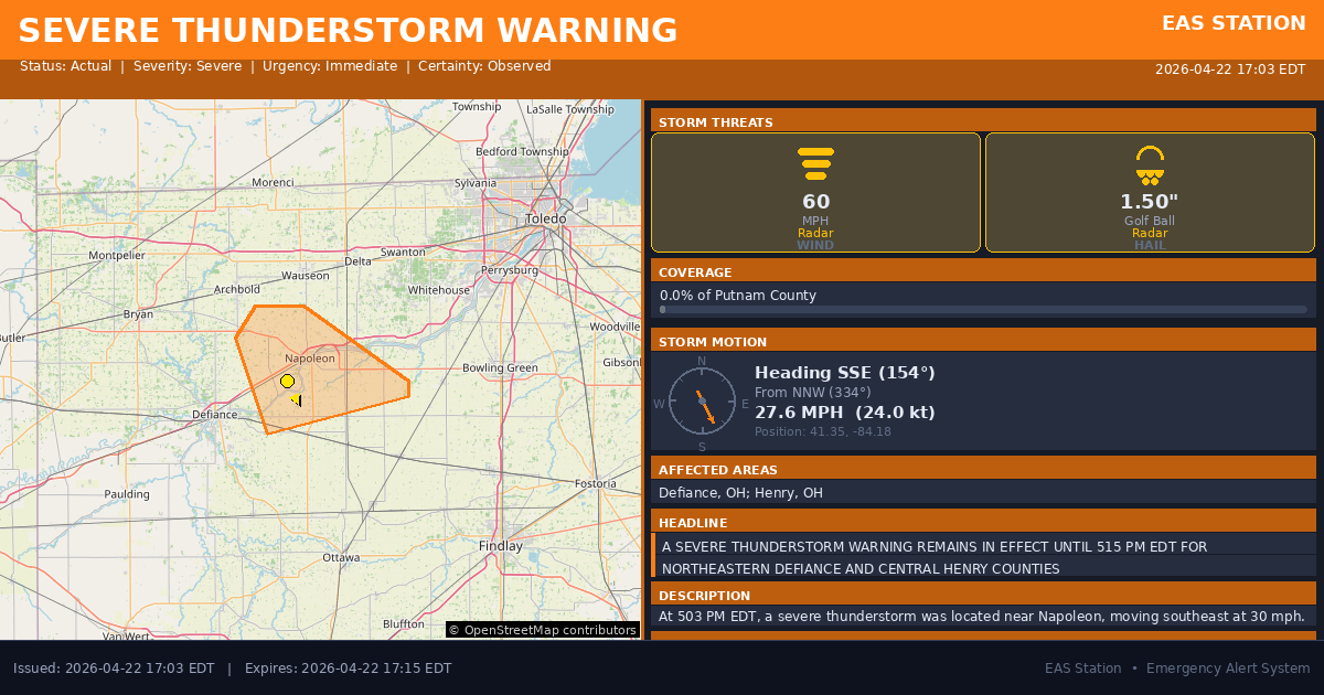 At 503 PM EDT, a severe thunderstorm was located near Napoleon, moving southeast at 30 mph.