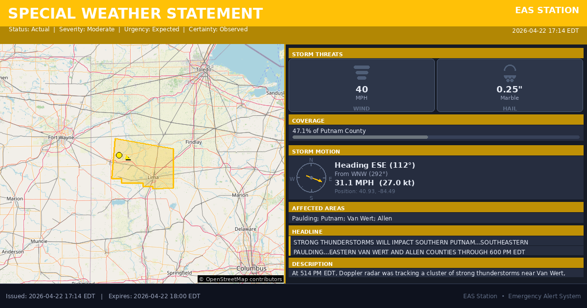 At 514 PM EDT, Doppler radar was tracking a cluster of strong thunderstorms near Van Wert, moving east at 30 mph.
