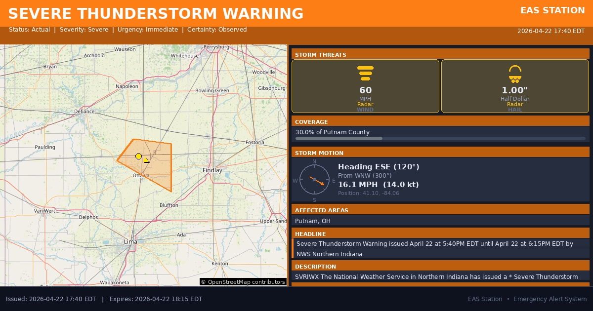 Severe Thunderstorm Warning issued April 22 at 5:40PM EDT until April 22 at 6:15PM EDT by NWS Northern Indiana