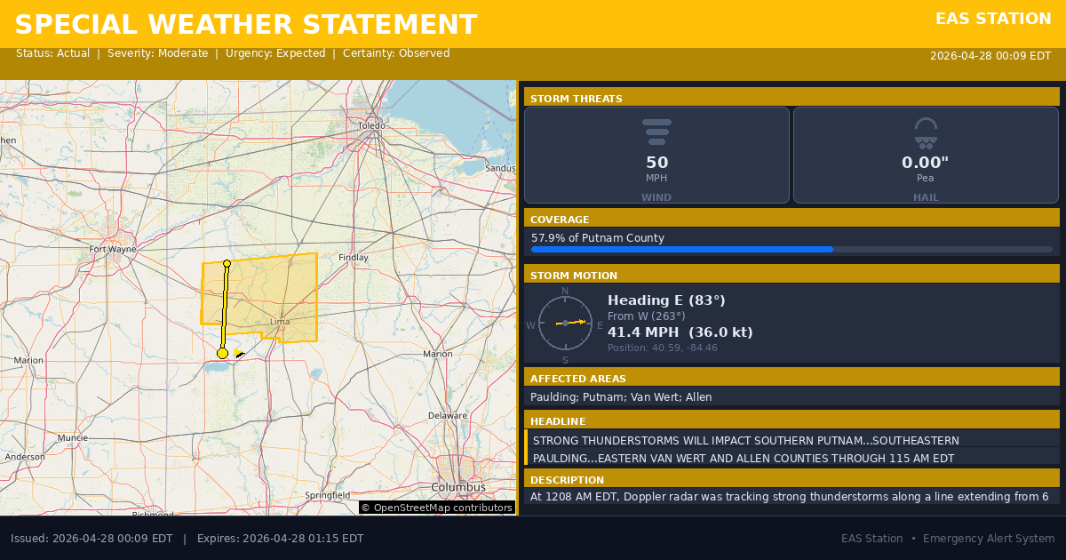 At 1208 AM EDT, Doppler radar was tracking strong thunderstorms along a line extending from 6 miles northwest of Ottoville to near St. Marys. Movement was east at 45 mph.